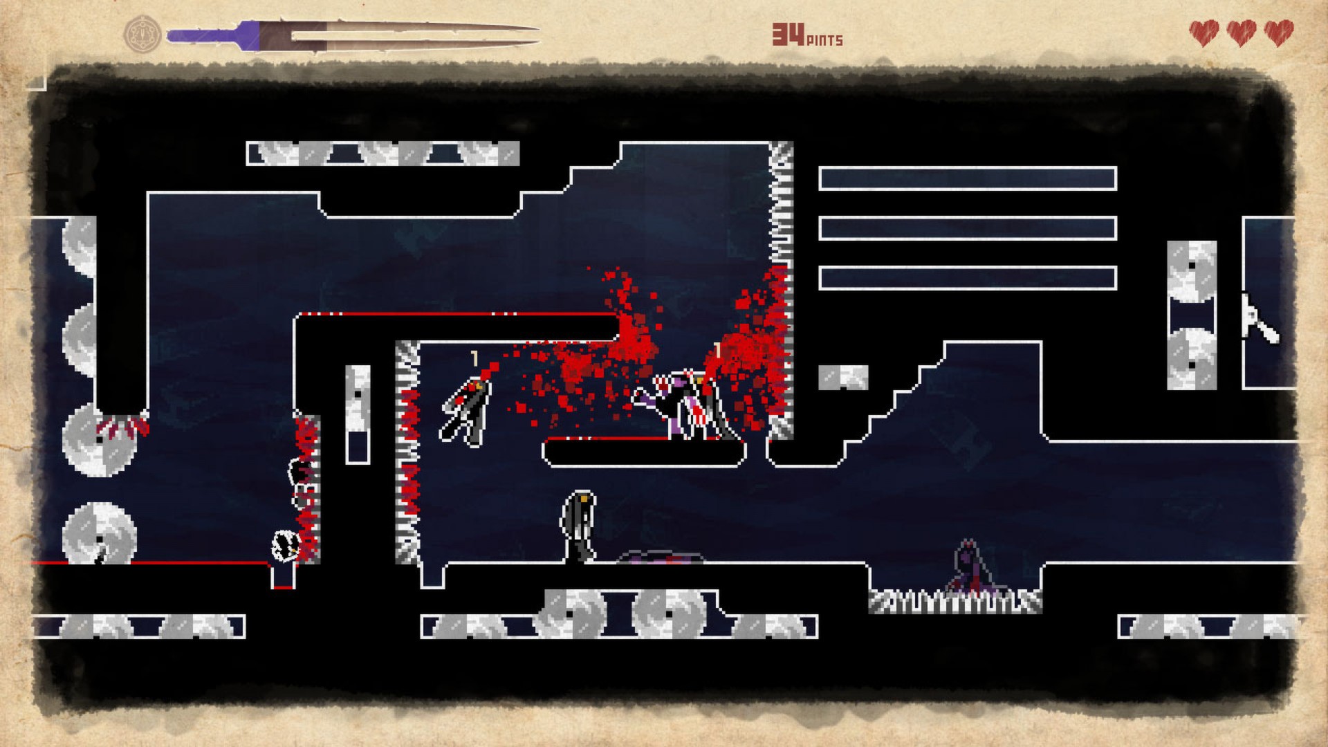 They Bleed Pixels is a fiendishly difficult action platformer inspired by H.P. Lovecraft and classic horror. Rendered in a distinct visual style that blends pixel art with paper and ink textures, They Bleed Pixels is a singular mix of intense platforming and fierce beat-em-up action. At the core of its fighting system is a simple one-button combat scheme with surprising depth and versatility. Button mashing is discouraged while kicking shadowy monsters into saws, pits and spikes is rewarded, thanks to a unique system that lets you earn and place your own checkpoints through stylish kills. The fancier your kills, the faster you fill the checkpoint meter.