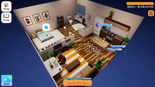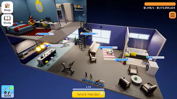 Move to seven unique apartments with different distractions and upgrades to be made. Upgrade and eliminate several distractions, including cats, computers, phone calls, and notifications. Don't forget about neighbor noises, fire alarms, coffee machines, washing machines, water plants, power interruption, mosquitoes, bugs, falling items, and more!