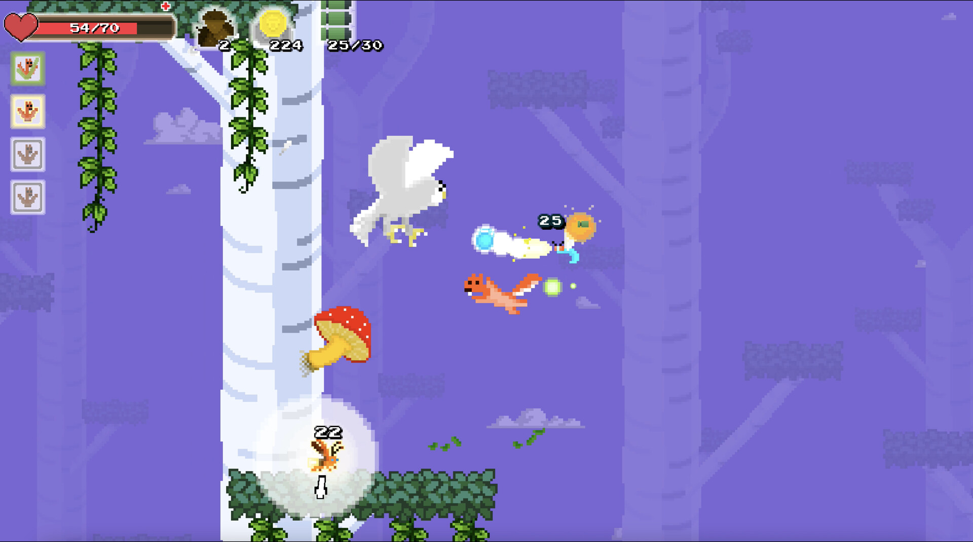 Leśna Platformówka z elementami Roguelite! Bądź Wiewiórem, śmigaj po gałęziach, chlastaj wrogów ogonem i strzelaj ważko-pistoletem. Dostarczaj orzechy swoim leśnym pobratymcom i dowiedz się co zaburzyło równowagę lasu.