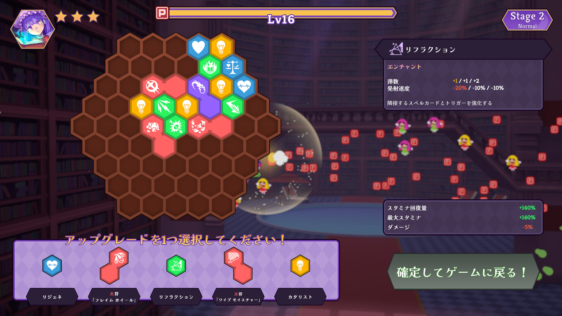 柔軟な強化システムを使ってパチュリーのスペルカードをアップグレードしよう。跳ね返り、毒、貫通、追加投射、さらには追加スペルカードなどを加えて飛躍的に進化させよう! ただし、パチュリーのスタミナとのバランスに注意してね!