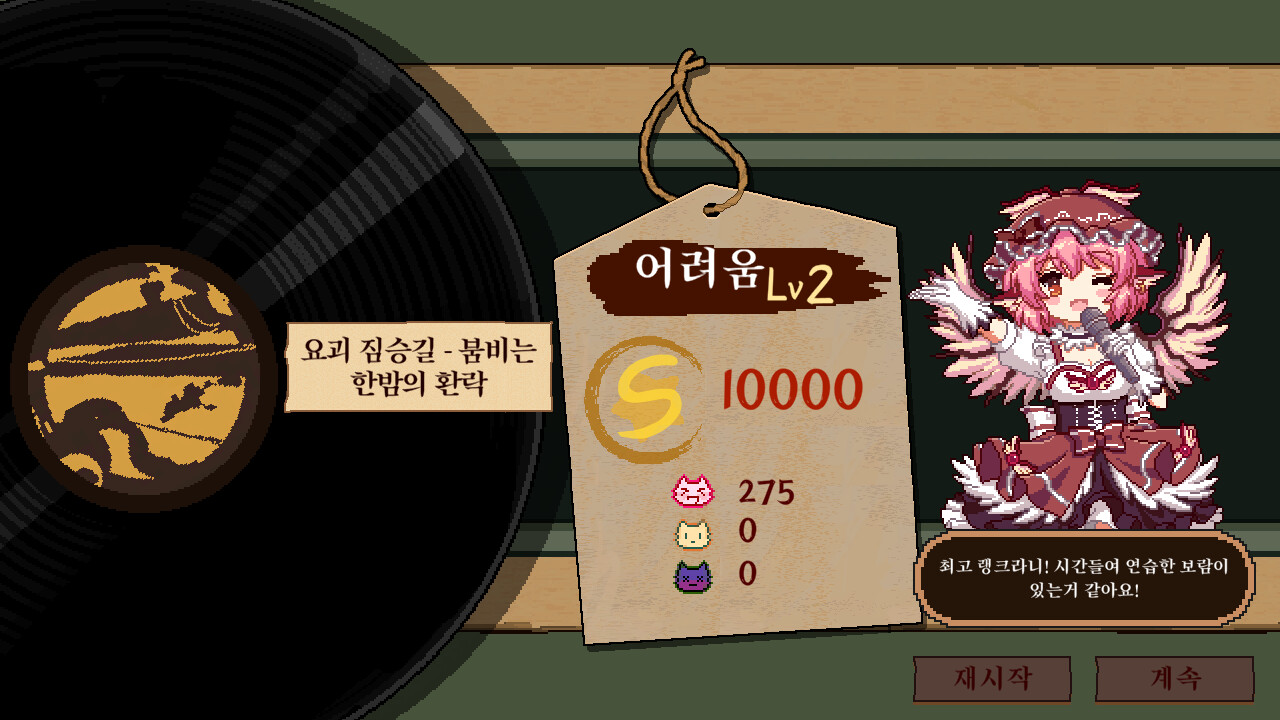 게임에 등장하는 지역─요괴 짐승길, 인간 마을, 하쿠레이 신사 등……각 지역의 노래 세 곡을 완수하고 다음 지역으로 넘어갑시다.
