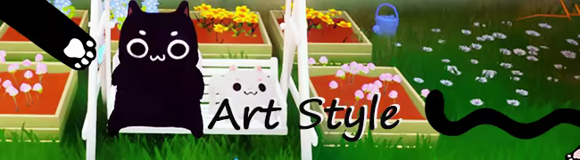• Let's take a look at our protagonist—a little black kitty cat who's fallen from the skies and landed here, an island most mysterious. Having recovered their white cat backpack, our feline friend sets off on a journey to retrieve their lost batteries and find their way back to the rocket.
