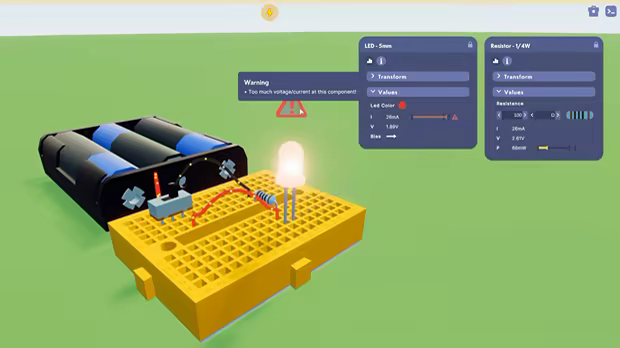 Read simulated electrical values (current, voltage, power, ...), and change component specific values (eg. resistor value). A warning sign appears when there’s something wrong with your circuit. You can hover over the warning sign to get a bit more information.