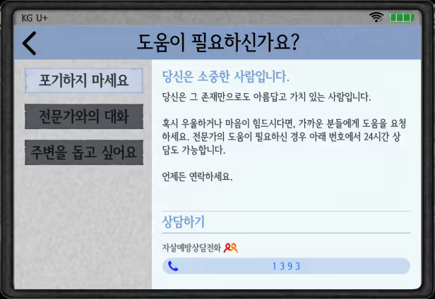 30 Days Another wants to raise awareness about suicide and say that suicide is a social problem that can be prevented through social and individual efforts. So, we wanted to have a device in the game where information could be accessed at any time for those in need.