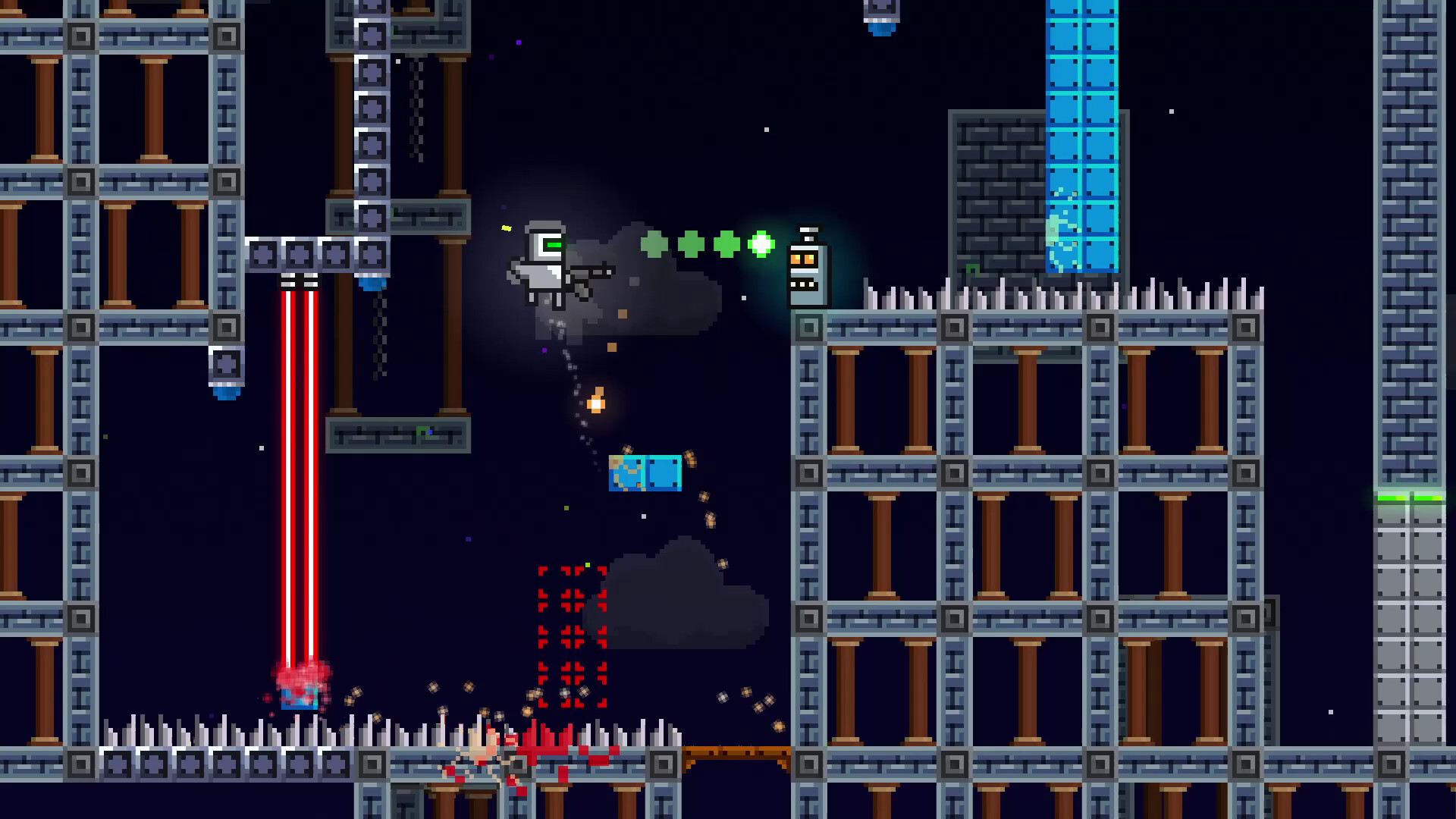 Enjoyable game hazards such as enemy-spawning portals activated by a light trigger, burning falling blocks, moving platforms, conveyor belts, lasers or timed disappearing blocks.
