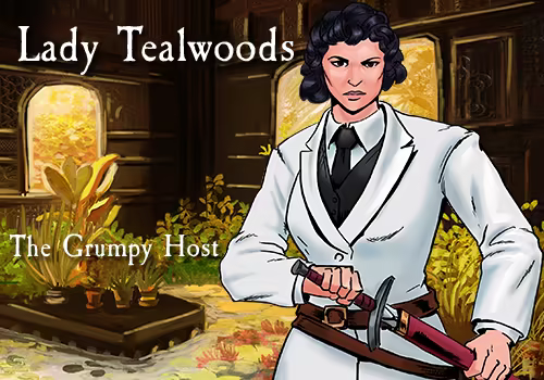 You've been invited to a strange party at Lady Tealwoods' new mansion. The other members of the guestlist are strange and often quarrelsome, and you are all locked in until midnight. A sudden murder is revealed, and you must piece together who is lying, and who is the murderer as you uncover the secrets of the different strange guests of Tealwoods Manor.