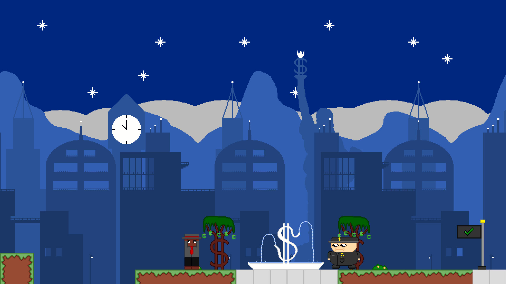 During the course of this game, Rectangle Guy will find himself in a lot of different areas. From the relaxing Grassy Plains to the gorgeous Profit City, there's always more to see. And, I mean, I don't wanna spoil anything but lemme tell ya some of the later worlds get WACKY.