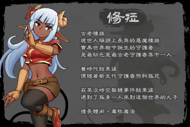 修菈跟九子所在一個東洋風貌的大都市,都市裡面有獸人、亞人、蜥蜴人、哥布林……等多樣人種,以及人類等高智力物種,是已有不小發展的文明社會。