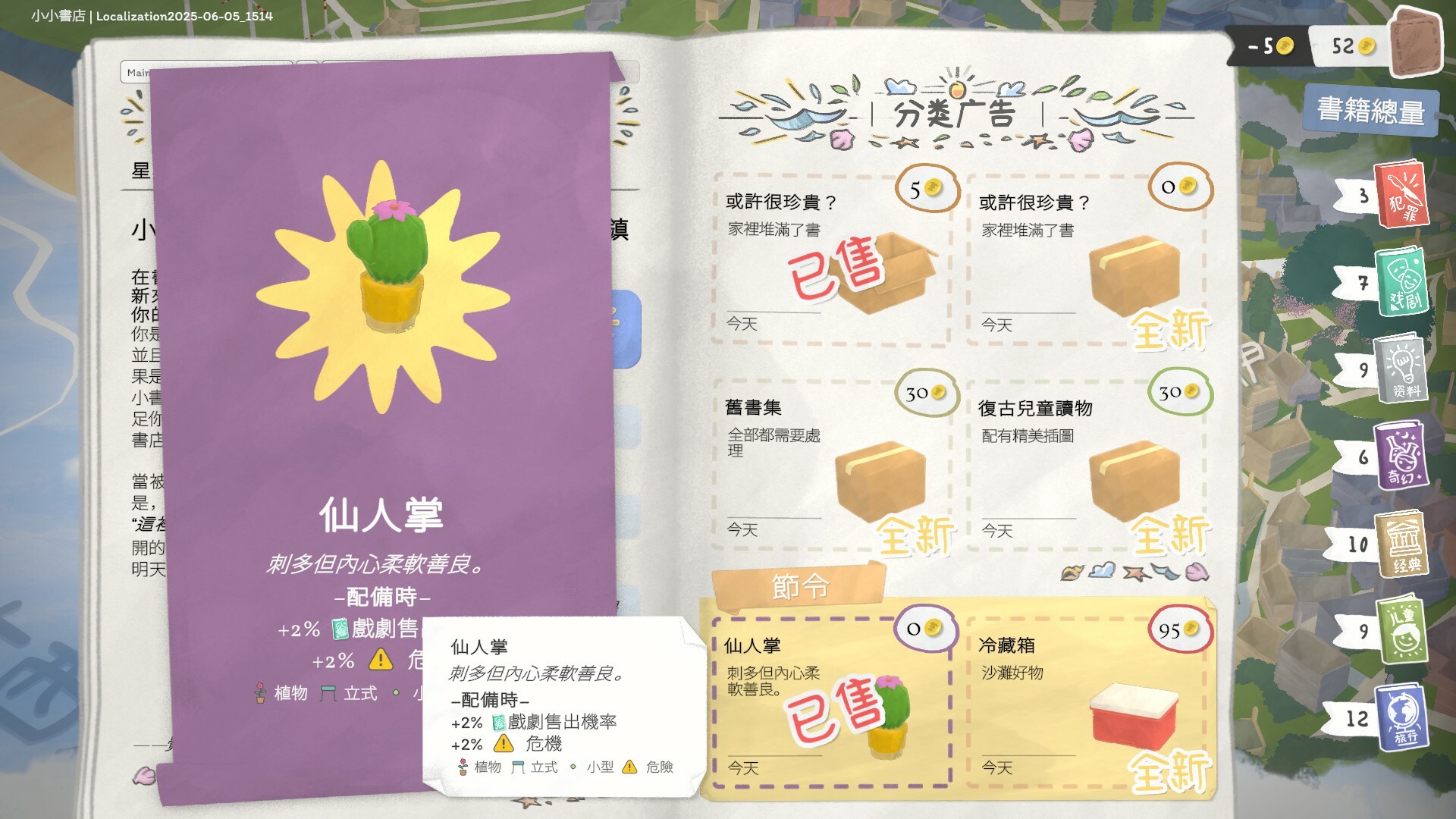 根據不同地點顧客的喜好,精心挑選書籍種類堆滿書架。向來訪的顧客推薦合適的書,滿足他們的閱讀需求。遊戲內書目均基於真實出版物,並專為中文版本進行了本地化適配,讓你在虛擬書店中也能讀到熟悉又意外的作品。