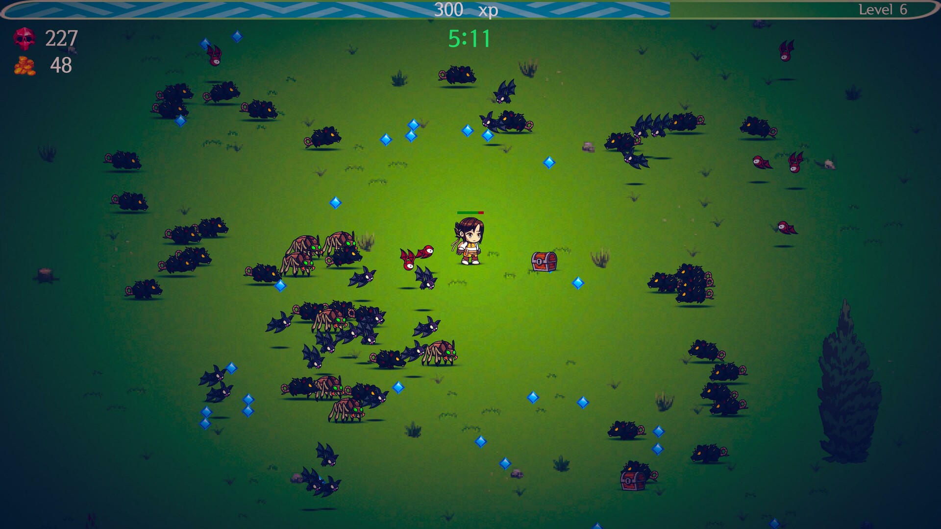 • Minimalistic timed survival gameplay with roguelite elements