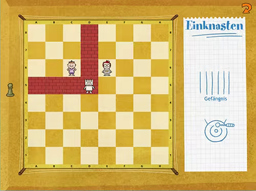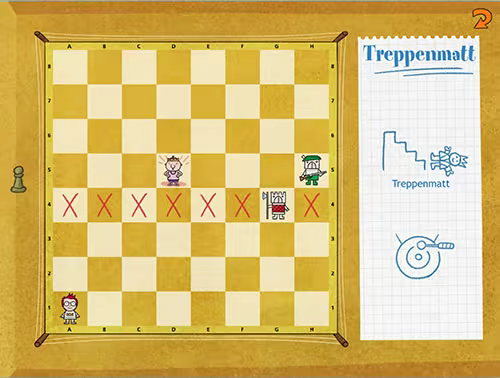 Wenn alle Trainingseinheiten im Leicht-, Mittel- und Schwergewicht absolviert sind, ist der große Augenblick gekommen: In der Schach-Arena kommt es zum Finale: das Duell gegen den fiesen König Schwarz. Jetzt heißt es, mit voller Konzentration gegen den gefährlichen Gegner zu spielen. Hier zeigt sich, ob man schon ein kleiner Stratege oder ein großer Taktiker geworden ist. Und mit etwas Glück und viel Geschick wird es dann auch gelingen, die Ehre des eigenen Königshauses zu verteidigen.