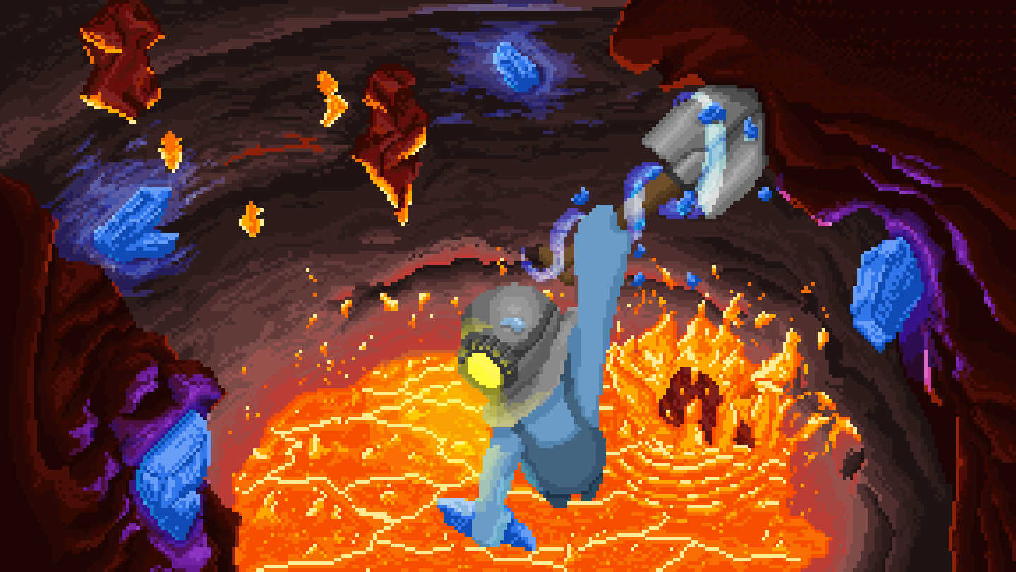 You are equipped with a magical shovel, that allows you to hang off of it for better maneuvering from rock to rock, throw it and destroy magma blocks on your path, and teleport to it.