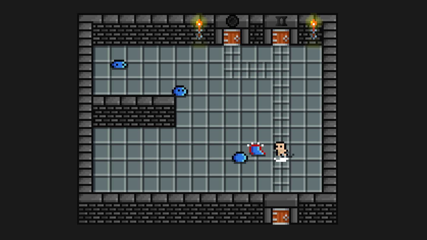Hack & Schlitz is an epic random-generated Arcade-Roguelike game. Starting a run will spawn you in a 2d-Pixelstyle dungeon where you can decide what difficulty the next room has.