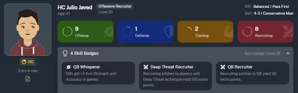 Earn XP to level your coach's offense, defense, training, and recruiting skills. Choose new skill badges throughout your career, each granting special bonuses to player performance, development, or recruitment.