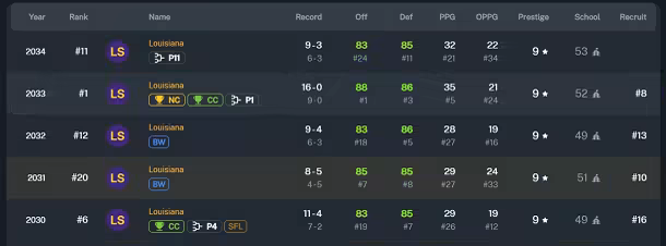 Scout and recruit players from all over the country, competing against other schools in tense recruiting battles. Pitch your team to recruits, schedule official visits, and even offer NIL deals.