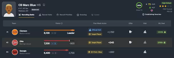 Scout and recruit players from all over the country, competing against other schools in tense recruiting battles. Pitch your team to recruits, schedule official visits, and even offer NIL deals.