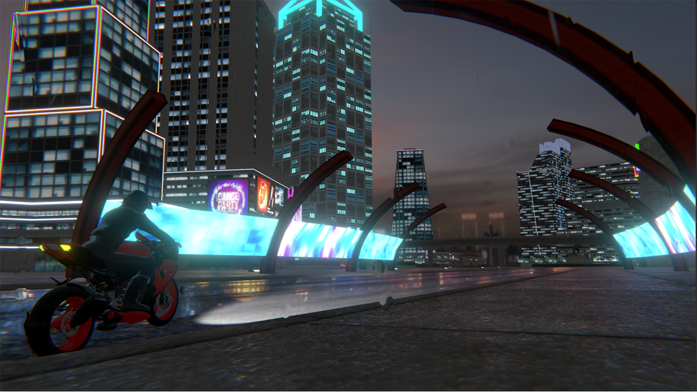 Skid is being developed by EXEAIO Studio. An indie studio with AAA dreams. We were frustrated by the lack of open world VR bike racing sim in PCVR and Oculus Quest 2 so we ultimately took the leap of faith. Skid features the adrenaline-fueled police chase inspired by the NFS series and also features a cluster of semi-open world 5km square maps inspired from cyberpunk where players can free-roam with our AI traffic system. Additionally, players can take part in pop-up races in the VR world followed by occasional cops show-down. We have a robust multiplayer mode where players can participate in seasonal championships for trophies. Both standalone quest and PCVR versions have cross-plays and are almost identical in terms of maps and features. Both versions are still actively in development.
