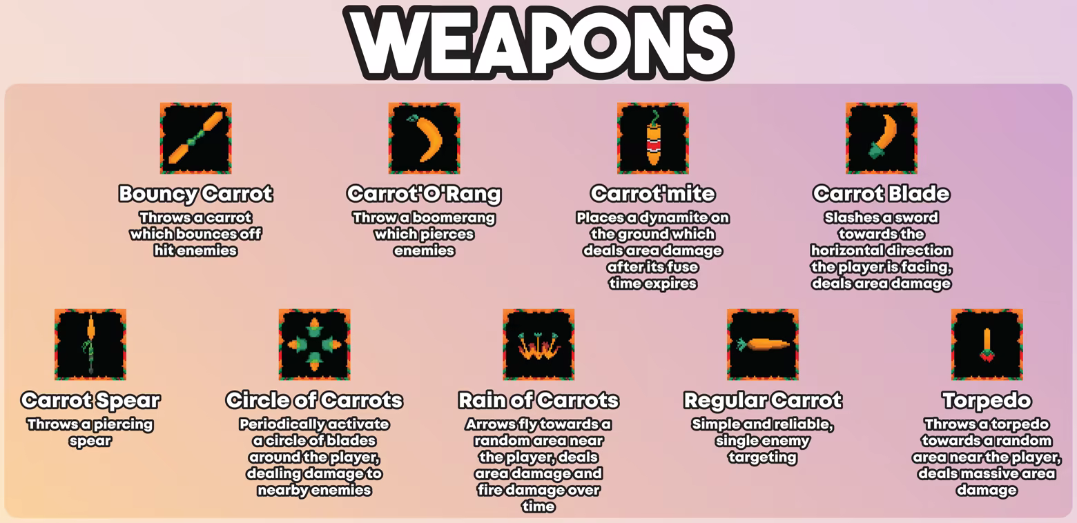 You can equip up to 4 weapons at the same time, targeted weapons, random positioned weapons, melee weapons, try them out and find the perfect combo!