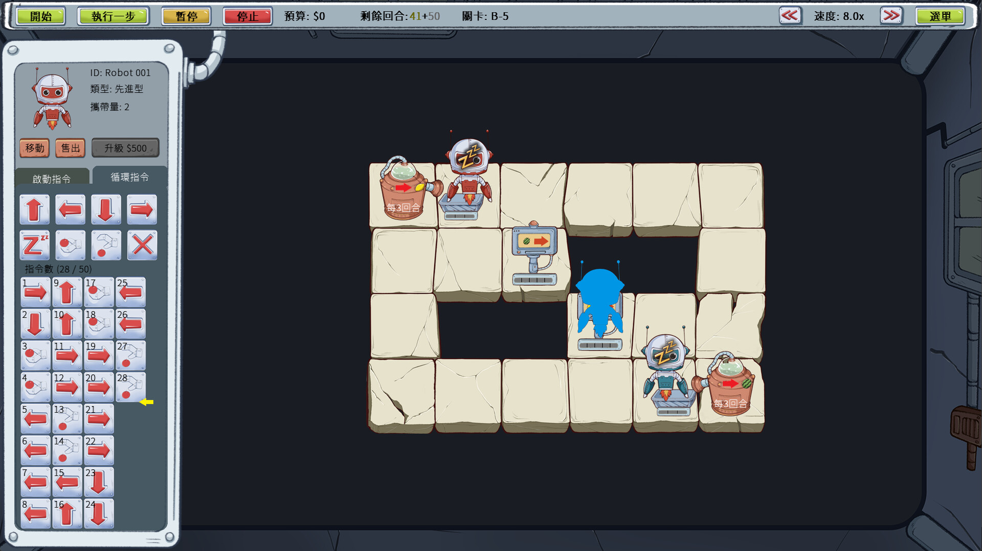 .只有↑、↓、←、→、休眠、裝載、卸貨 7條指令。