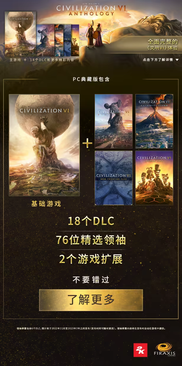 Steam上《文明VI典藏版》的新老用户可免费获得领袖季票,季票内容分6次发放。