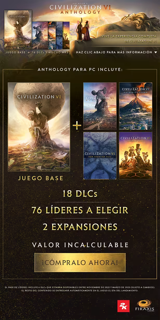 * Se requiere el juego base para acceder a todo el contenido del Pase de Líder de Civilization VI y packs de DLC adicionales para acceder a ciertos líderes. El Pase de Líder solo está disponible en Steam y Epic. En Steam y Epic, el Pase de Líder estará disponible para su compra y ya está incluido como parte de la Civilization VI Anthology Edition.