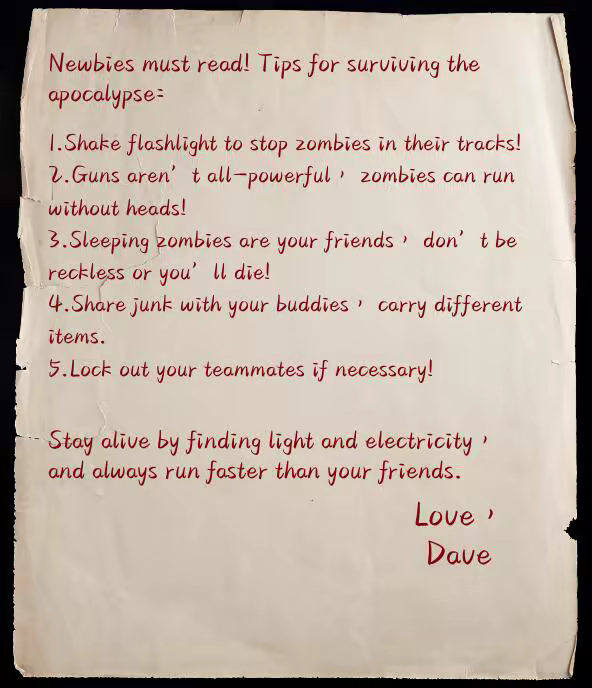 In an unknown environment, only this light can bring a little warmth, but the continuous decline of the battery is stripping away my sense of security, I have to escape! A zombie game for 1-4 players. In darkness, players use flashlights to affect zombie behavior, explore, escape and reach the end.
