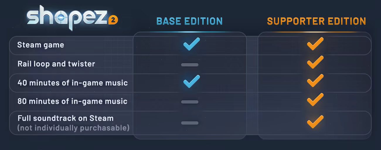 Important Note: By buying the supporter edition, you are first and foremost showing your support for shapez 2. The rail cosmetics and additional music tracks are just the bonus on top!
