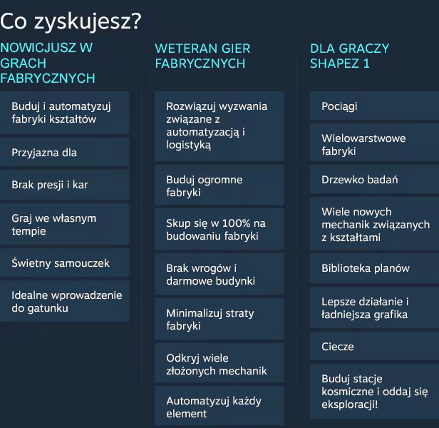 Dostarczaj konkretne kształty, aby odblokować nowe technologie, rozszerzając możliwości i skalę swojej fabryki, aby tworzyć jeszcze bardziej unikalne kształty. Zacznij od rozbudowy jednego taśmociągu do ogromnej wielostanowiskowej kosmicznej fabryki na trzech połączonych ze sobą poziomach. Zadbaj o wydajność i zoptymalizuj każdą platformę lub rozszerz działalność w nieskończoną przestrzeń i połącz milion budynków kosmiczną kolejką – to ty decydujesz, jak będzie wyglądać twój kompleks przemysłowy.