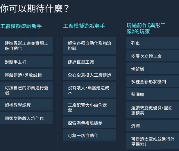 • 多層 3D 工廠:設施與平臺間各自存在三層對應空間,如此工廠可得小心規劃精打細算!別忘了用星際傳送帶和星際列車打通全廠!