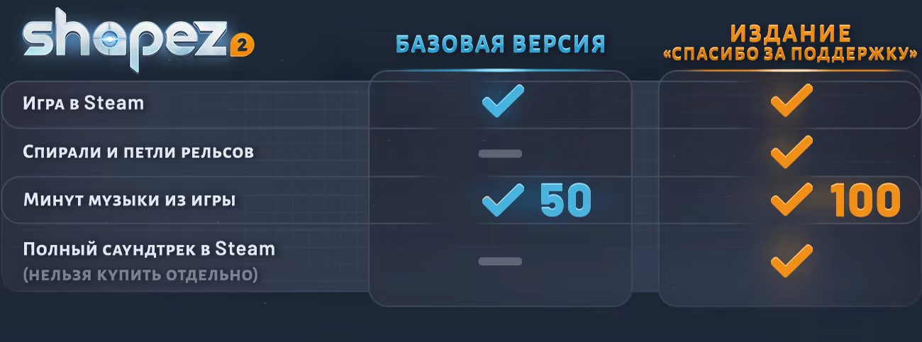 Важно: покупая издание «Спасибо за поддержку», вы прежде всего поддерживаете shapez 2. Косметический набор для рельсов и дополнительные музыкальные треки — просто вишенка на торте!