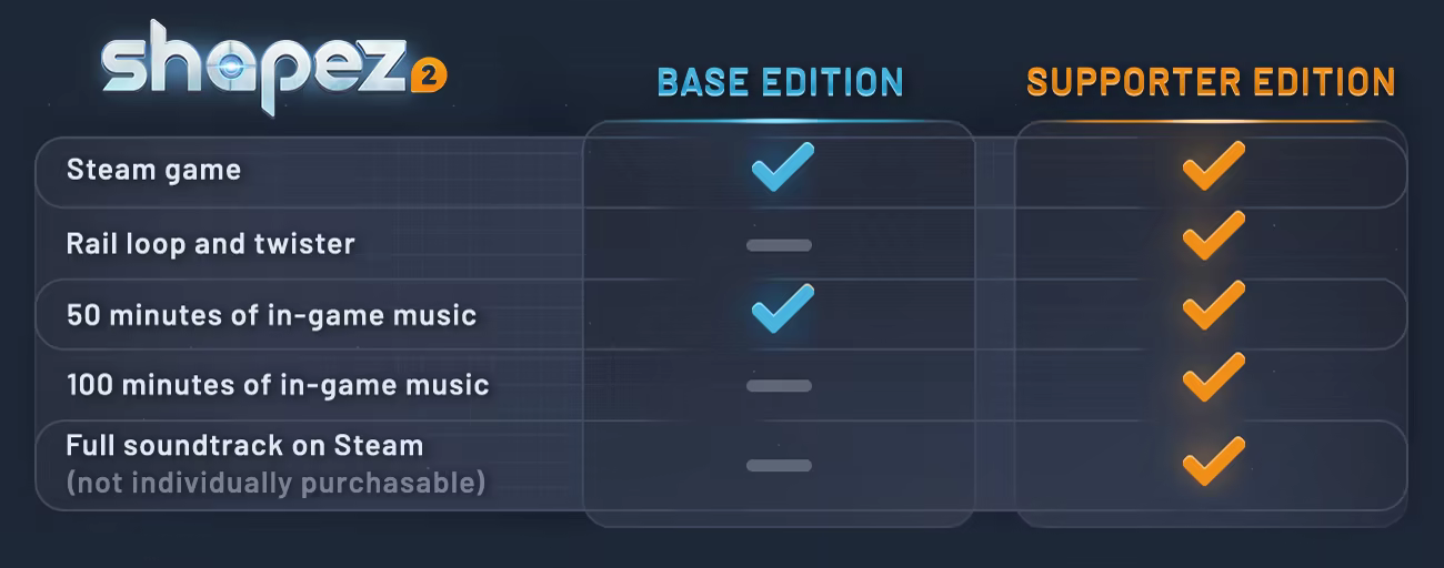 Important Note: By buying the supporter edition, you are first and foremost showing your support for shapez 2. The rail cosmetics and additional music tracks are just the bonus on top!