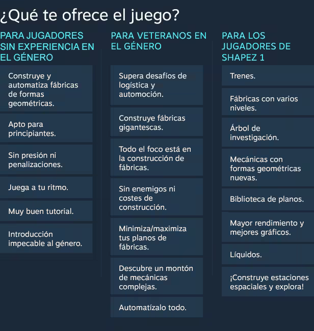 Shapez 2 es un juego de construcción de fábricas con vista cenital donde extraes y procesas formas geométricas. Cada forma está compuesta por una serie de piezas de construcción que podrás separar, apilar, pintar y volver a juntar en la fábrica de un montón de maneras únicas. Construye y automatiza procesos para producir formas únicas y resolver cada uno de los desafíos que te presenta el juego.