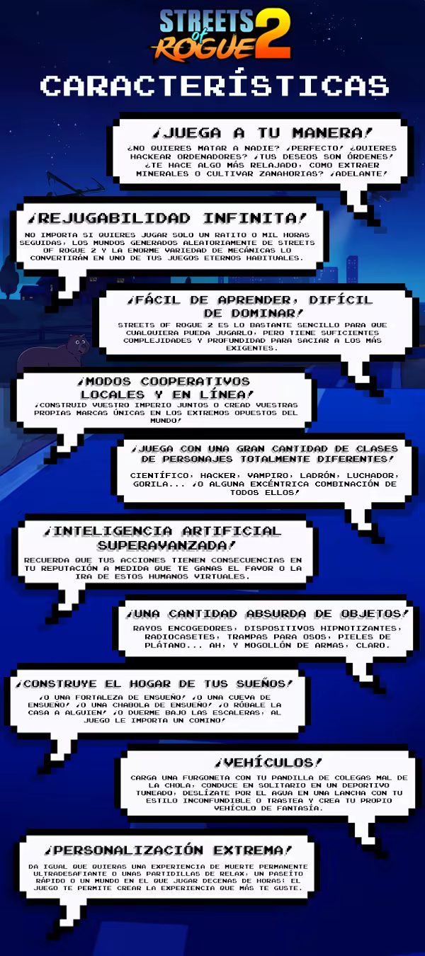 Streets of Rogue 2 te invita a un mundo abierto impredecible y lleno de vida donde todo es posible. Adéntrate en solitario o con amigos y embárcate en un viaje para derrocar a un presidente corrupto ¡como te dé la gana! Si te gustan los juegos centrados en la libertad y de estilo sandbox como Rimworld, Valheim, Stardew Valley, Kenshi, Terraria o Dwarf Fortress, ¡Streets of Rogue 2 es para ti! Disfruta de una experiencia sin paragón y enriquecedora generada por el sistema que te permite interactuar con el mundo de muchas formas y todas ellas inimaginables.