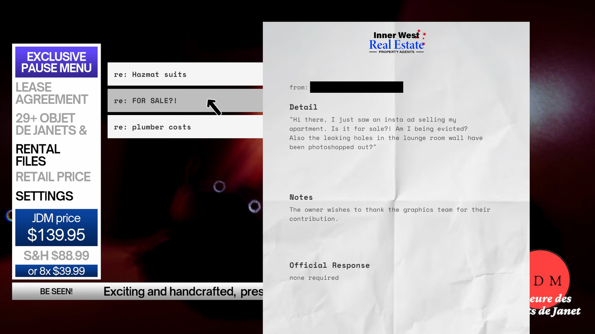JDM is about being a renter. It’s about landlord overreach. It’s about a legal system built by landlords for landlords. It’s about being a queer and having a found family. It’s also about a witch. And that witch is very interested in what you’re doing. What you’re doing right now. In fact she wants to see you. Please answer the door, Andrew. I have a right to see what you’re doing in my house Andrew this is just a little tenant pop-in why won’t you answer the door answer the door answer the door answer the