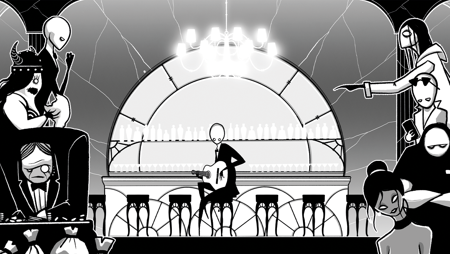 The musical term morendo means that passages in a piece of music should be performed "dying". Morendo is a point & click adventure game about a concert guitarist whose life takes dramatic turns after his performance. Join him and meet peculiar characters that are waiting for you in the Voyeur. Interact with them and step behind the curtain of betrayal, lust and the facade of show business. This game was developed in a game jam, within 48 hours. Enjoy the real sounds of live recorded guitars and immerse yourself in the macabre, hand-drawn world of Morendo.