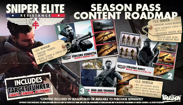 Carry on the fight with the Sniper Elite: Resistance Season Pass! Return to the action in a new expansive three mission campaign, arm yourself with a bolstered cache of authentic World War II weapons and customise your operator with new character and weapon skins.