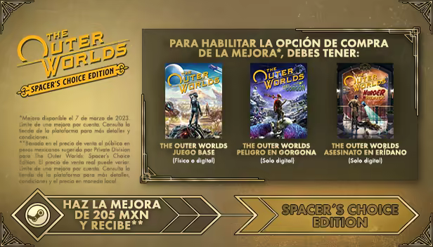 Los jugadores que ya tengan The Outer Worlds y los DLC Asesinato en Erídano y Peligro en Gorgona en Steam pueden actualizar su versión a The Outer Worlds: Spacer’s Choice Edition por un precio reducido.* Para habilitar la opción de compra de la actualización, los jugadores deben iniciar sesión en la misma cuenta de Steam que usaron para comprar el juego base y sus DLC correspondientes y elegir la opción de compra "Completar el lote".