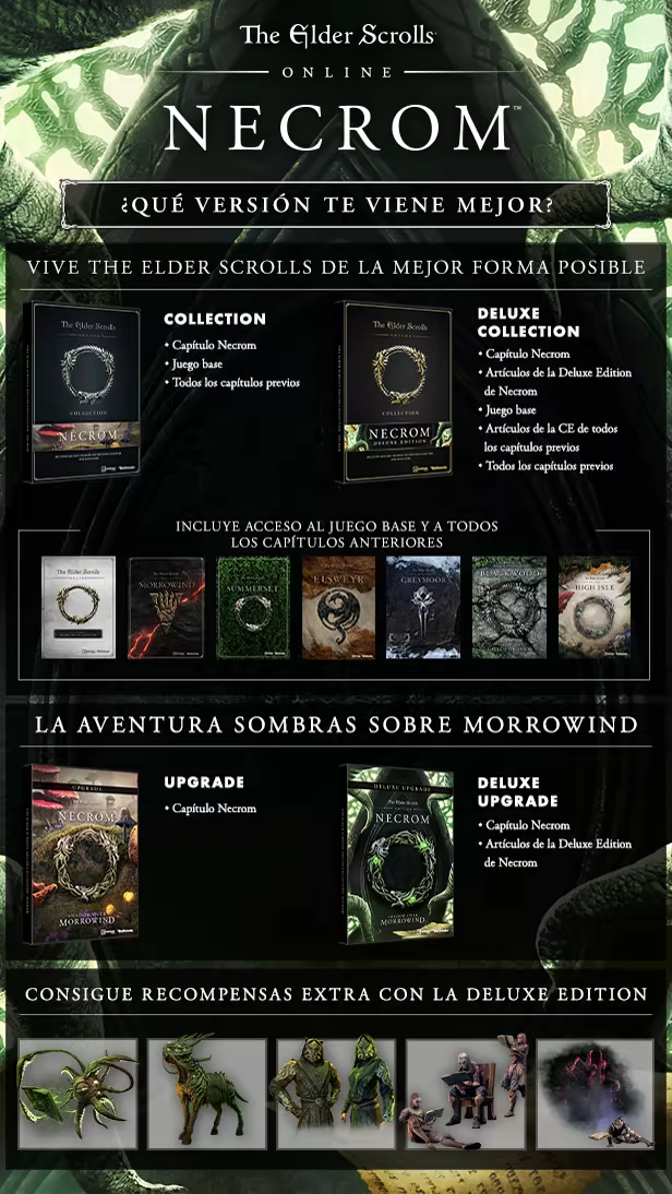 The Elder Scrolls Online Collection: Necrom y The Elder Scrolls Online Deluxe Collection: Necrom incluyen el juego base, Necrom y todos los capítulos previos (High Isle, Blackwood, Greymoor, Elsweyr, Summerset y Morrowind). Si compras Deluxe Collection: Necrom, también recibirás objetos Deluxe. Quienes compren las ediciones Collection, podrán acceder de inmediato al juego base, a Necrom o a cualquier capítulo previo.