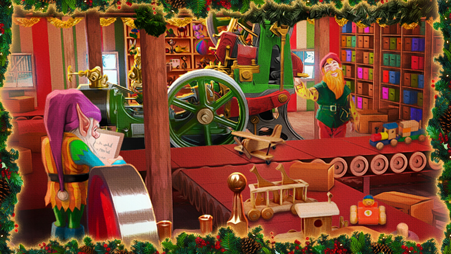 Meanwhile, at the North Pole, Santa is reading all the letters sent to him from children across the World and he gives his Elves a list of toys that need to be made in their exciting and busy workshops. The Elves have to work night and day to get the toys made in time. One of the Elves is sick in bed so Mrs Claus goes to look after him and then makes a magnificent Christmas Eve lunch to be sure everyone will have plenty of food for the long afternoon and night ahead.