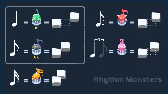 Rhythm monsters help you know the next beat, so it's very important to memorize each rhythm monster's pattern. In particular, the black rhythm monster (8th note) and the green rhythm monster (quarter note) appear the most!