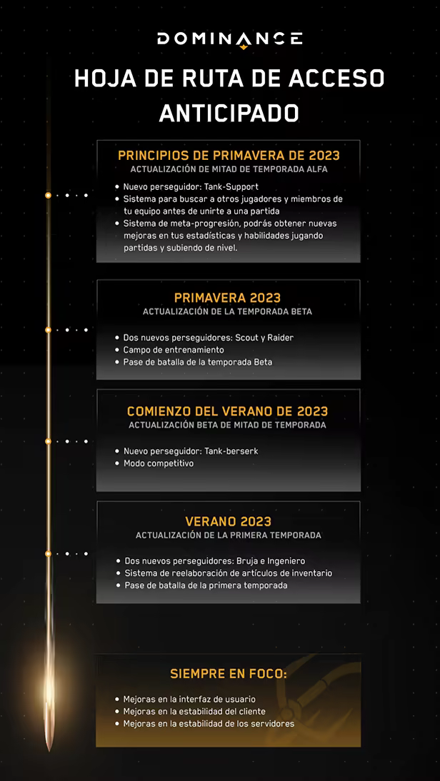 «Vemos el acceso anticipado como una gran oportunidad para construir nuestro juego junto con nuestra comunidad, para hacerlo lo mejor posible. Los comentarios de los jugadores son esenciales para nosotros y los vemos como uno de los aspectos más importantes al desarrollar Dominance. Exprese sus ideas y opiniones sobre el juego en Steam Discussions o nuestro Discord; prometemos que las leeremos todas.»