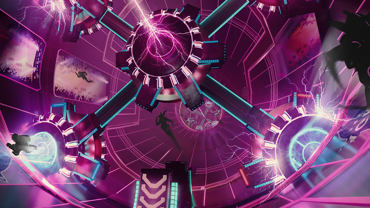 The gravity system in Space Rats is unique because it is based on the concept of centripetal force. The race courses are all housed within long, cylindrical space stations that rotate around a central axis of rotation. Because of the rotation, ‘gravity’ flows out from the center of the course in every direction. This means that no matter where a character stands inside the course, they can always look “up” and see the center of the course, represented by a glowing Artificial Gravity Line (or A.G.L. for short).