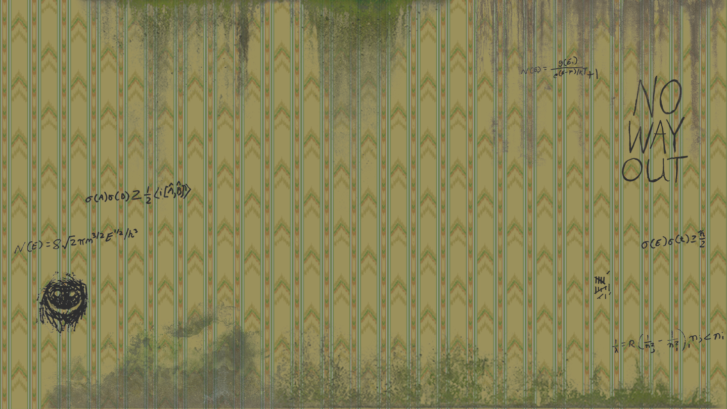 After a skydiving accident, you awaken with your cheek pressed against a damp beige carpet. The tacky, off-white wallpaper looks yellow on your video camera's view screen.