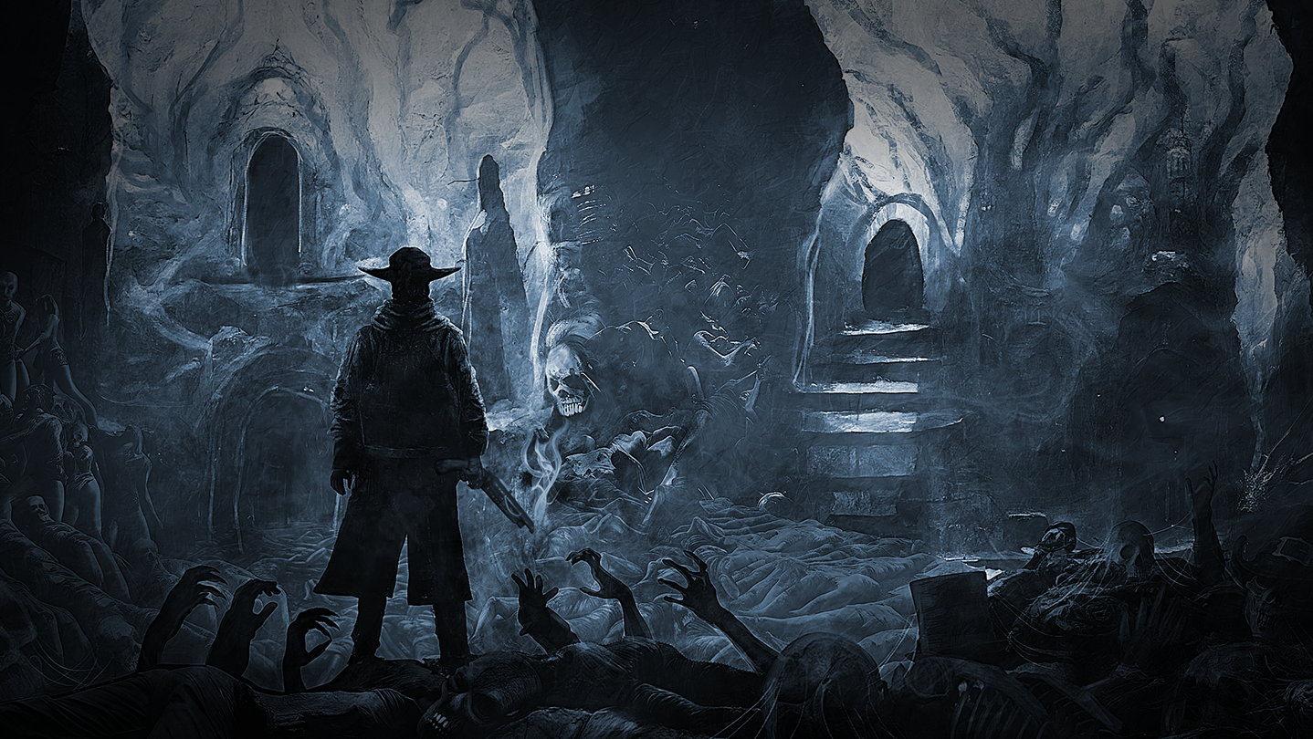 • Dark horror atmosphere with black humor