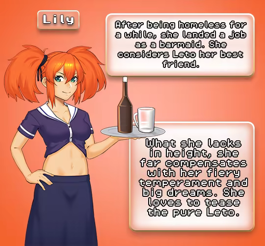 Help Leto navigate through the turmoils of his life in the city of Luminia and interact with the women close to him. Slow burn pixel art NTR eroge with an engaging storyline, plenty of spicy content, tons of custom sprites and animations, hidden events, sexy ambiance sounds, and much more!