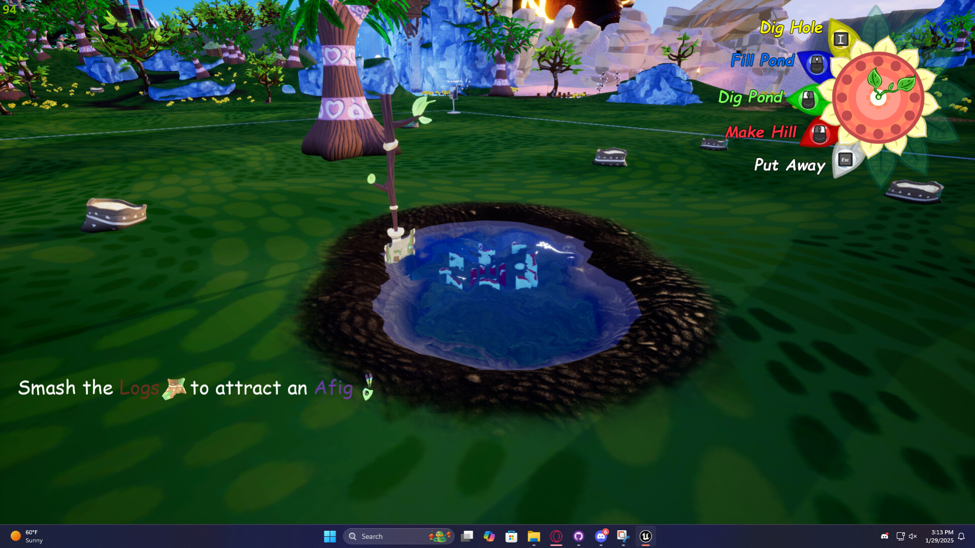 “There are currently 4 Piñatas, 3 Plants/Trees, 7 Fruits/Vegetables, and 11 Houses/Decorations immediately available in the game. Outside of these, there is a working Day/Night Cycle, the ability to store and retrieve items in a crate, the ability to terraform the landscape with the shovel (create/destroy hills, dig ponds), a basic map roughly representative of what the final landscape is envisioned to be, pinata AI to move around, sleep, and be directed by the player, and basic placeholder requirements for some of the piñatas to reside and romance.”