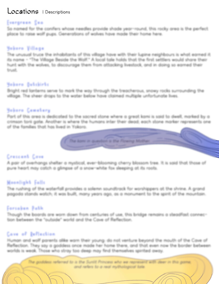 The Path of Kami Journey Begins Lore Book is a PDF that features the background story, scripts, and notes from the team that allows you to take a peek behind the scenes of the development process and story evolution of Path of Kami. The document outlines the plot synopsis, narrative themes and goals, dialogue, collectible descriptions, and more!