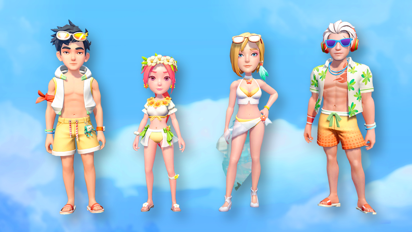 A swimsuit collection with outfits for Logan, Grace, Elsie, and Qi in 4 colors for each character. Each outfit contains a hat, top, bottoms, shoes, and 3 additional accessories.