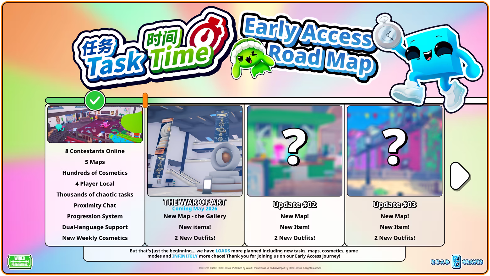 In the full version of Task Time, we are planning for additional tasks, maps, items, and free cosmetics, along with further polish and improvements. As we progress through Early Access, these plans may change and adapt based on player feedback.