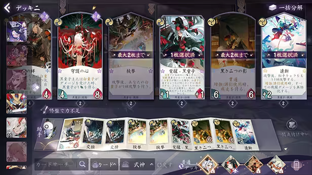 式神とカードのチョイスに工夫し、デッキの実力を最大限に発揮しよう。